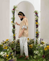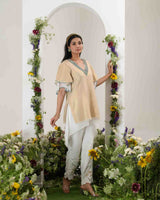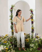 a perfect brunch co-ord with pure georgette and jute with detailing of sequnce on neck and cutwork on pants . Fabric-Georgette, Jute