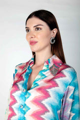 An uzbek print Pathani with detailing on collars.Fabric -Satin Georgette