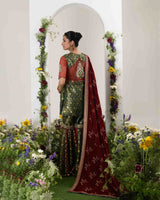 A pure brocade Gharara st with dabka and sequence work on neckline and sheer back with intricate handwork . Option of velevet dupatta or tulle dupatta . Fabric -Pure Brocade , Tulle, Velvet