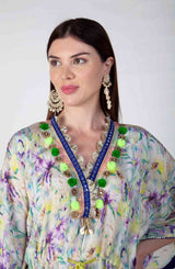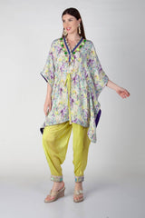 Kaftan with beautiful neckline work and cuffed dhoti pants. Fabric - Crepe amd Modal
