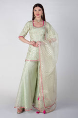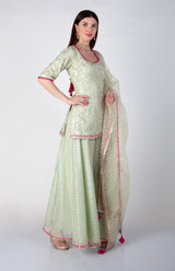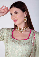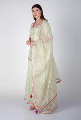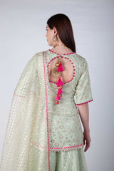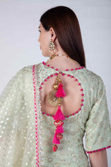Pure Organza and crepe suit with pink potli buttons and organza dupatta