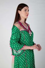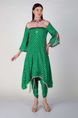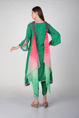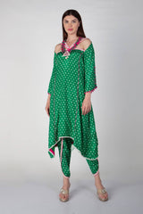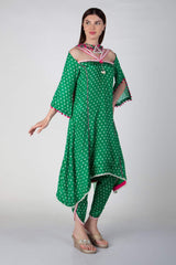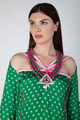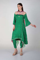 An apt outfit for bridesmaid in a mehndi function .Banbhej Indo-western suit with necklace dupatta and tulip pants