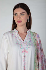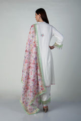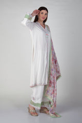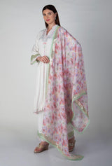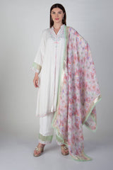 A beautiful Aline soft cotton silk suit with aari work and digital printed linen dupatta . Fabric -Cotton Silk, Linen