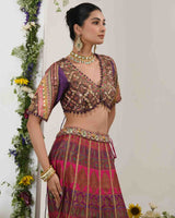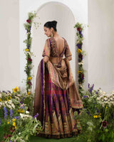 Sequences, mirrors, zardosiembroidery, dabka and silk thread intricately woven with cut dana embellishments. Raw silk choli and jute foli dupatta