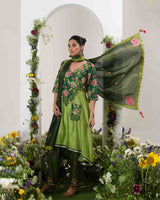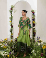 Pure Chanderi silk with heavy yoke and pants with georgette tissue dupatta . A stylish pocket makes it chic this diwali. Fabric- Chanderi Silk, Tissue
